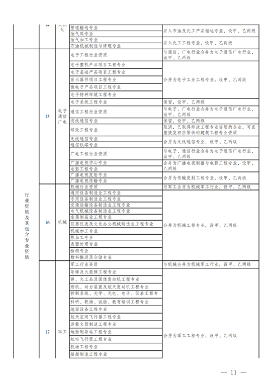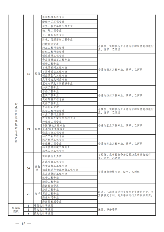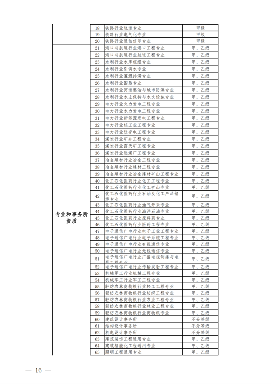 2.工程設(shè)計資質(zhì)。保留綜合資質(zhì);將21類行業(yè)資質(zhì)整合為14類行業(yè)資質(zhì);將151類專業(yè)資質(zhì)、8類專項資質(zhì)、3類事務所資質(zhì)整合為70類專業(yè)和事務所資質(zhì)。綜合資質(zhì)、事務所資質(zhì)不分等級;行業(yè)資質(zhì)、專業(yè)資質(zhì)等級原則上壓減為甲、乙兩級(部分資質(zhì)只設(shè)甲級)。