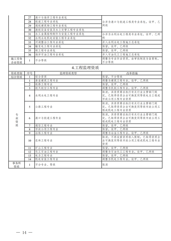 4.工程監(jiān)理資質(zhì)。保留綜合資質(zhì);取消專業(yè)資質(zhì)中的水利水電工程、公路工程、港口與航道工程、農(nóng)林工程資質(zhì),保留其余10類專業(yè)資質(zhì);取消事務所資質(zhì)。綜合資質(zhì)不分等級,專業(yè)資質(zhì)等級壓減為甲、乙兩級。