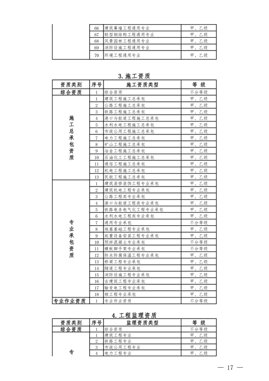 3.施工資質(zhì)。將10類施工總承包企業(yè)特級資質(zhì)調(diào)整為施工綜合資質(zhì),可承擔各行業(yè)、各等級施工總承包業(yè)務;保留12類施工總承包資質(zhì),將民航工程的專業(yè)承包資質(zhì)整合為施工總承包資質(zhì);將36類專業(yè)承包資質(zhì)整合為18類;將施工勞務企業(yè)資質(zhì)改為專業(yè)作業(yè)資質(zhì),由審批制改為備案制。綜合資質(zhì)和專業(yè)作業(yè)資質(zhì)不分等級;施工總承包資質(zhì)、專業(yè)承包資質(zhì)等級原則上壓減為甲、乙兩級(部分專業(yè)承包資質(zhì)不分等級),其中,施工總承包甲級資質(zhì)在本行業(yè)內(nèi)承攬業(yè)務規(guī)模不受限制。