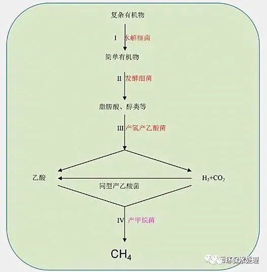 ④產(chǎn)甲烷階段——包括從乙酸形成甲烷,以及從氧、二氧化碳形成甲烷。